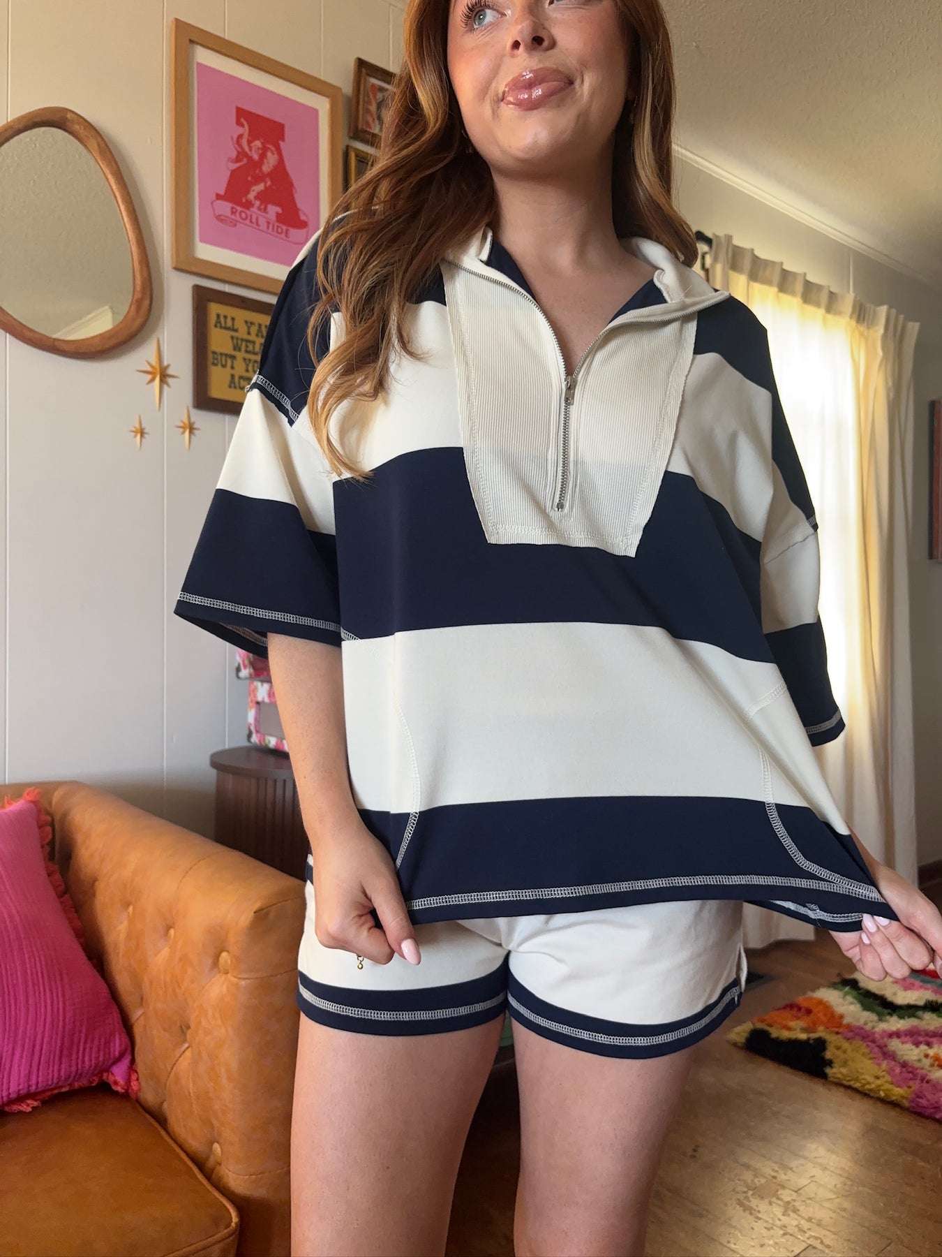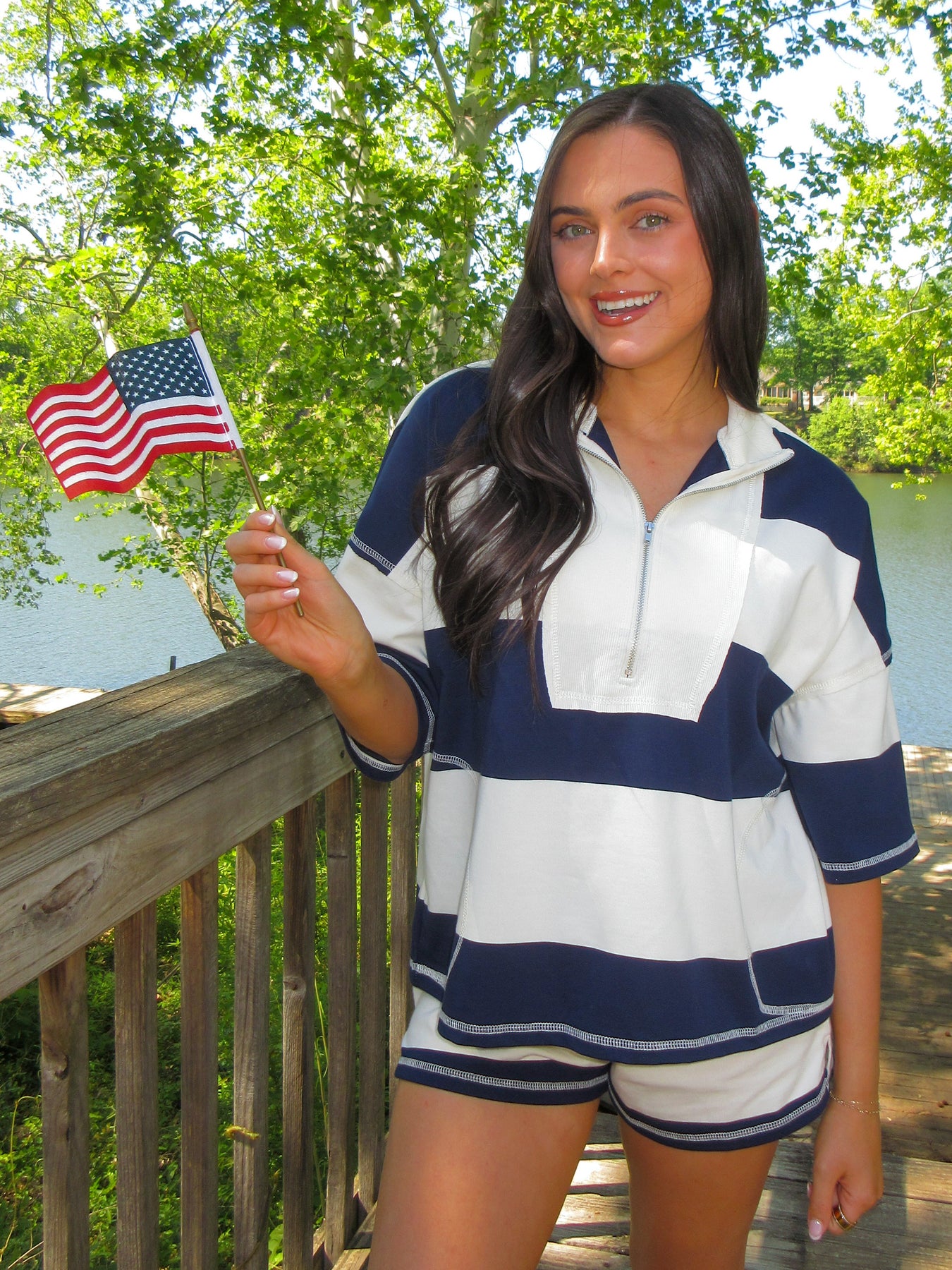Laid-back and effortlessly cool, this slightly oversized boxy top features bold navy and white stripes for a classic, coastal feel. The relaxed fit gives it that easy, throw-on-and-go vibe while still looking put together. Style it with the matching shorts for a coordinated set, or mix it with your favorite denim and basics for endless casual-but-cute outfit options.