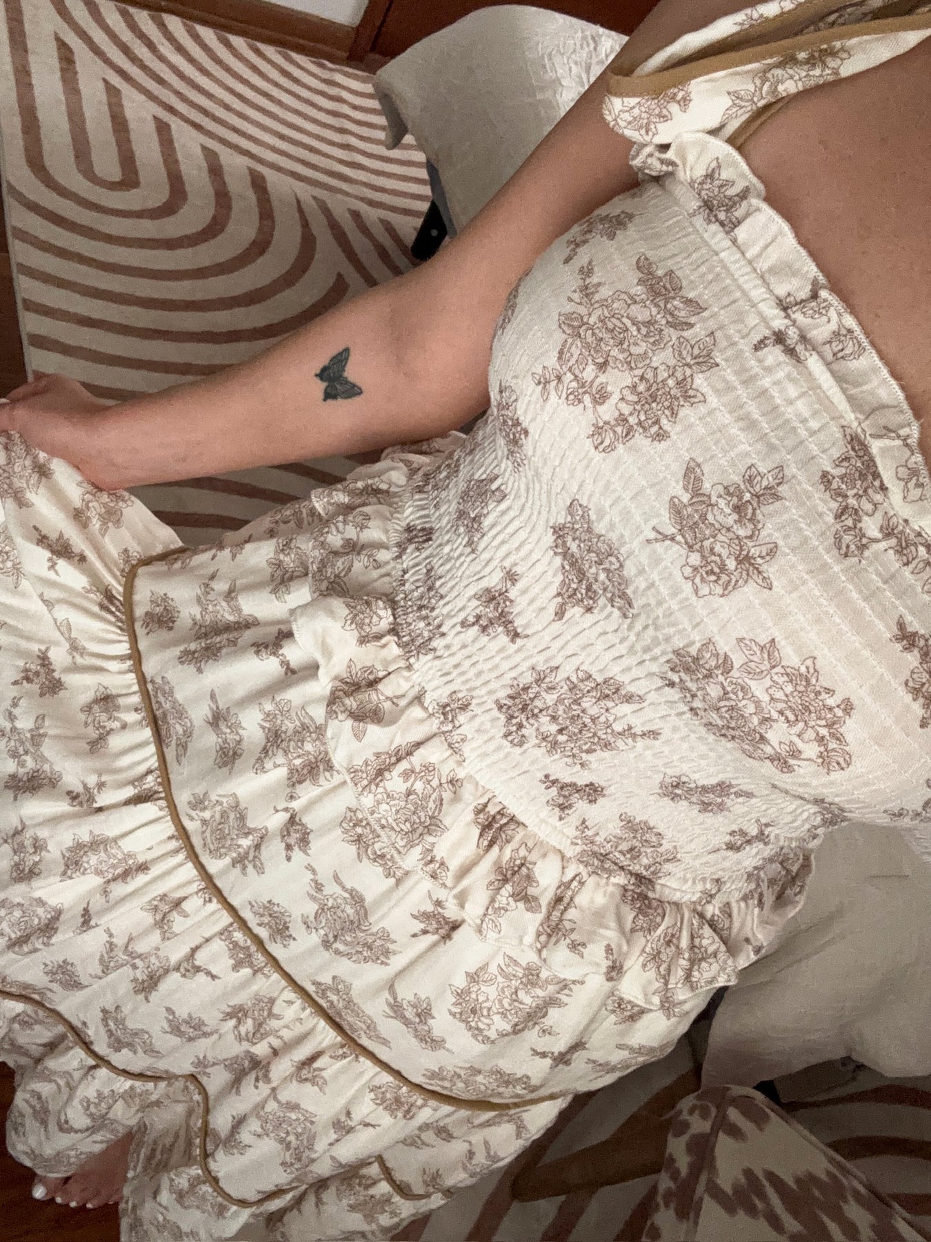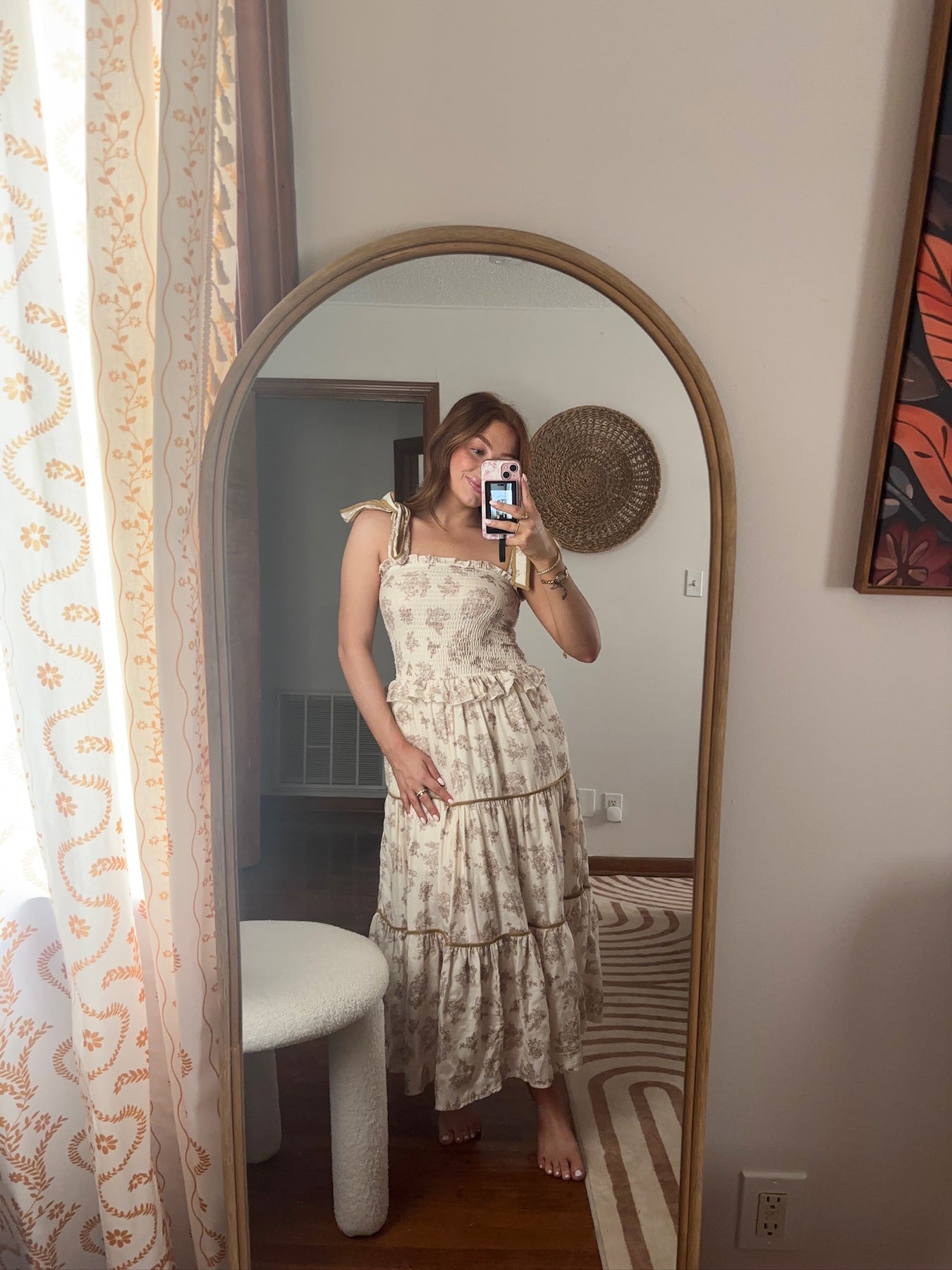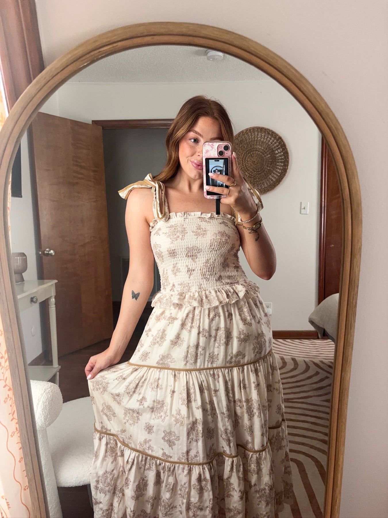This neutral vintage floral midi is effortlessly charming and perfect for any occasion. The tiered ruffles add flowy movement, while the tie shoulder straps let you adjust for the perfect fit. The smocked elastic bust hugs in all the right places for a flattering, comfortable feel. Whether it’s a brunch with friends or a garden party, this dress is a sweet, easy way to feel put-together and feminine.