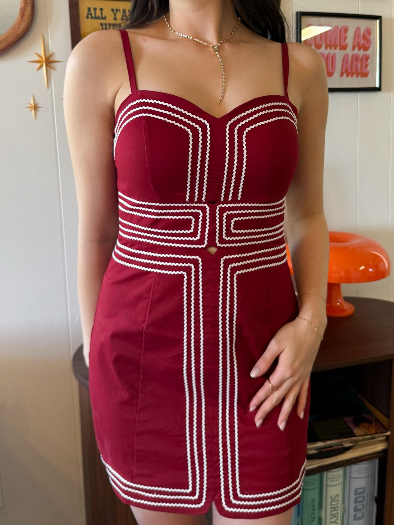 Bold, flattering, and made to stand out—this crimson mini dress is a total statement piece. Designed with a structured, figure-hugging fit, it features thin straps and a subtle sweetheart neckline for a feminine touch. The contrast stitching adds a unique, eye-catching detail that highlights your shape in all the right places, while a small front cutout gives it just a hint of edge.