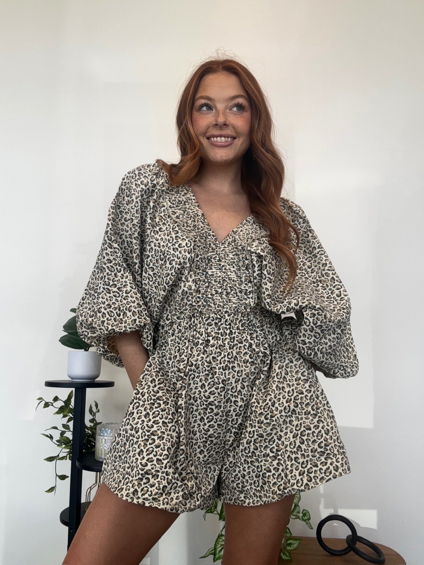 Fulfill your fashion bucket list with our Smocked Leopard Romper! Featuring a smocked v neck, ruffled leopard print, and balloon sleeves, this versatile romper is perfect for warmer weather. Dress it up or down and accentuate your waist with the synched design. Don't settle for boring outfits, add a touch of fun to your wardrobe with our romper!