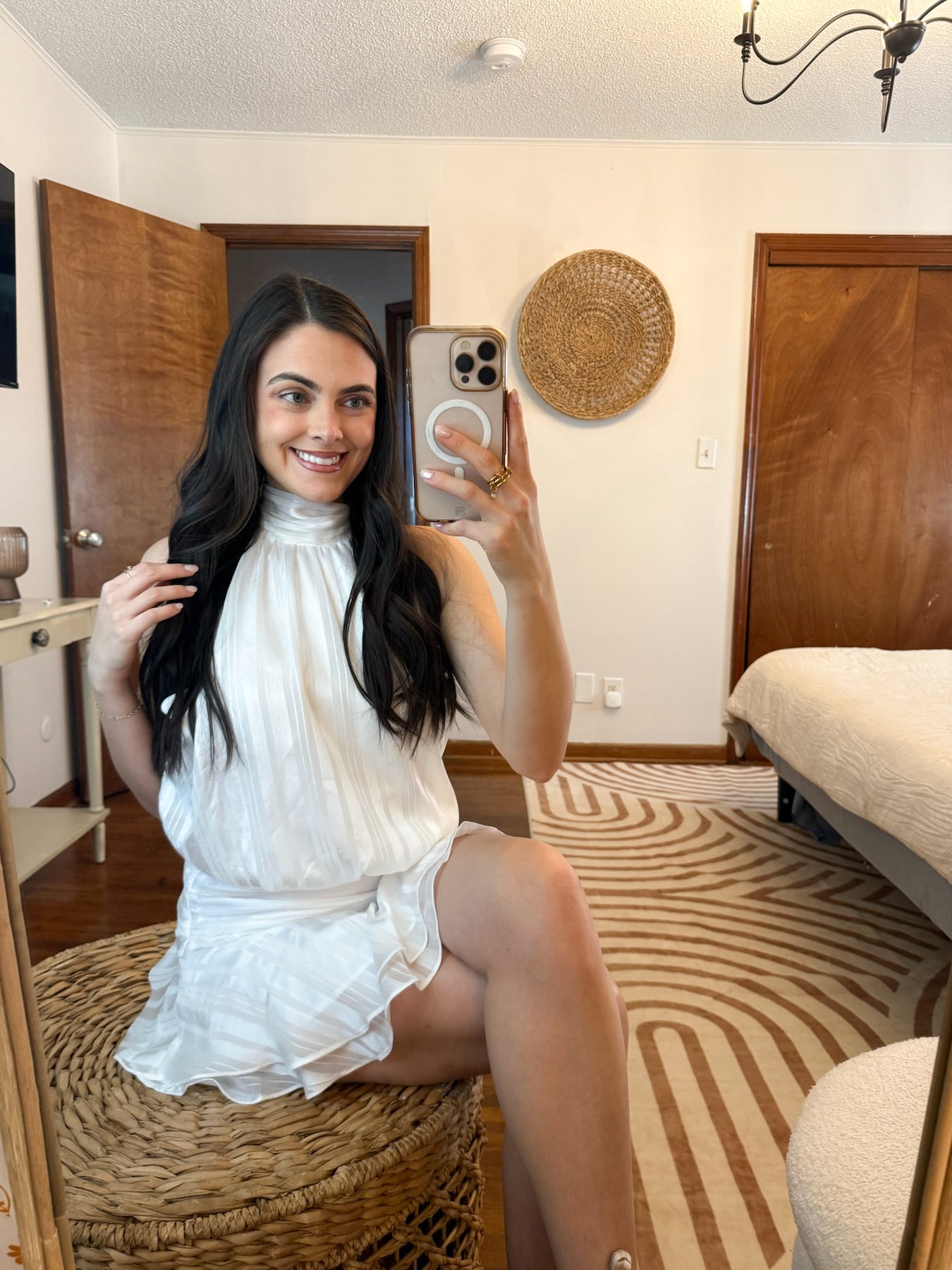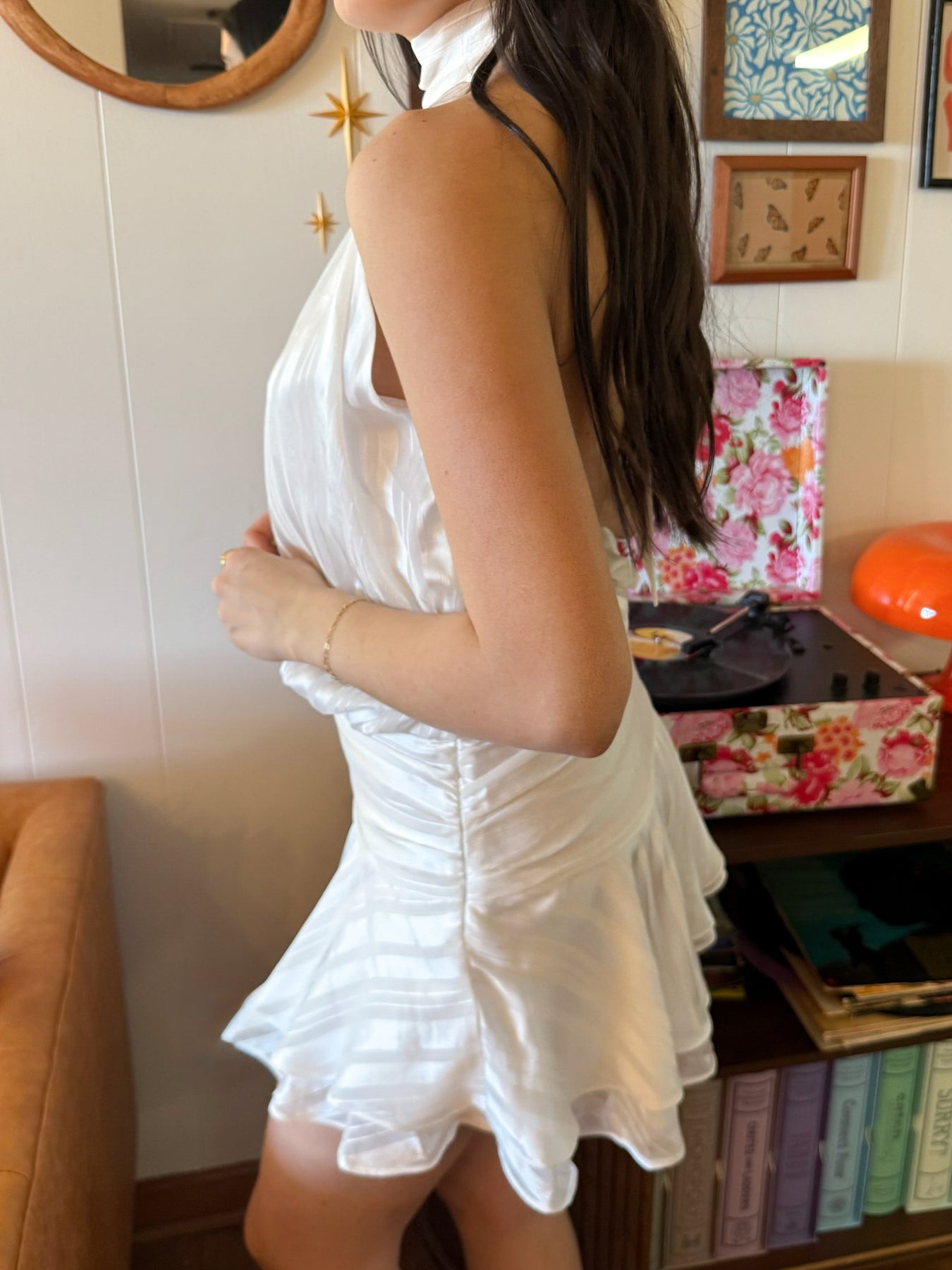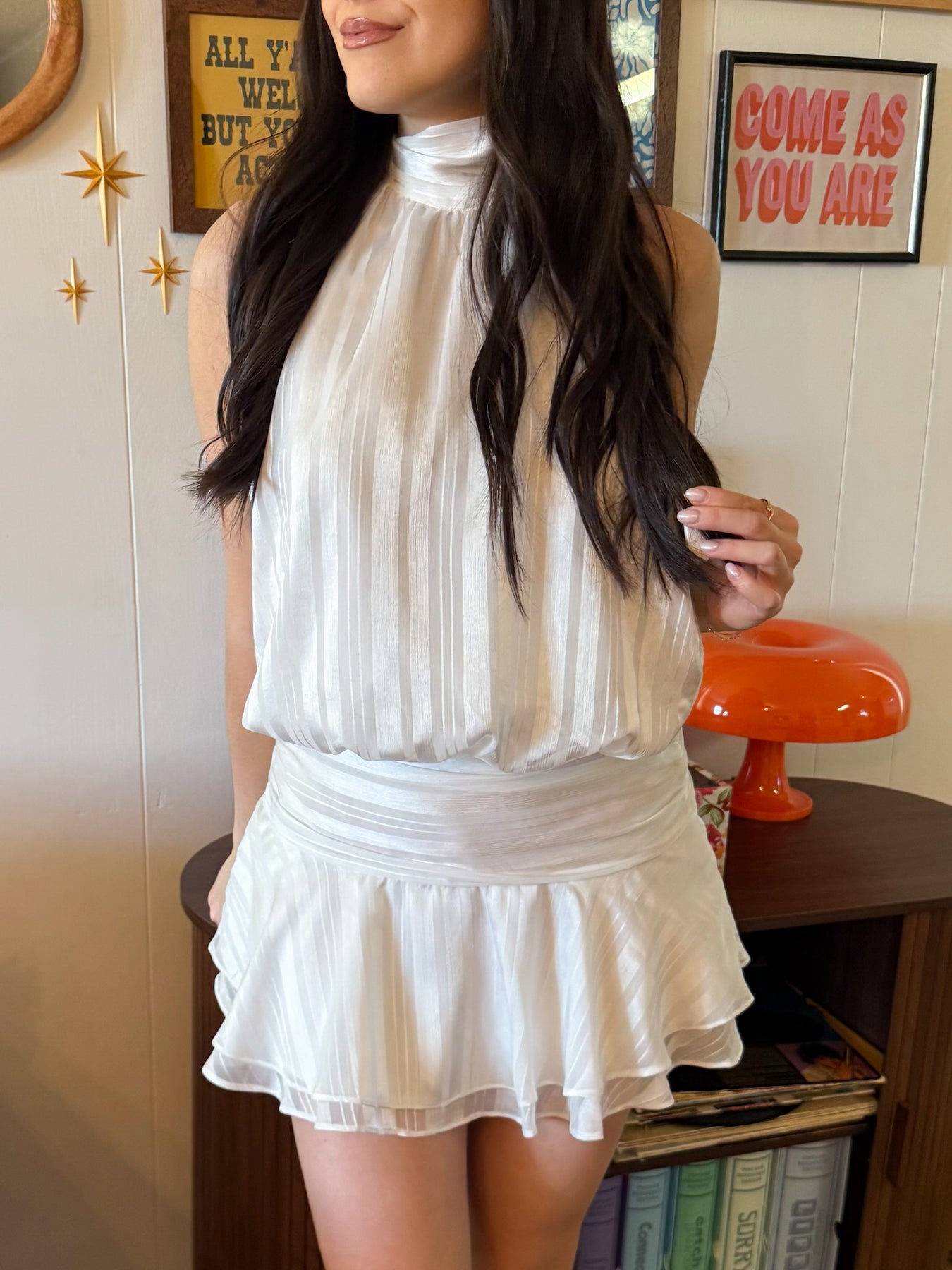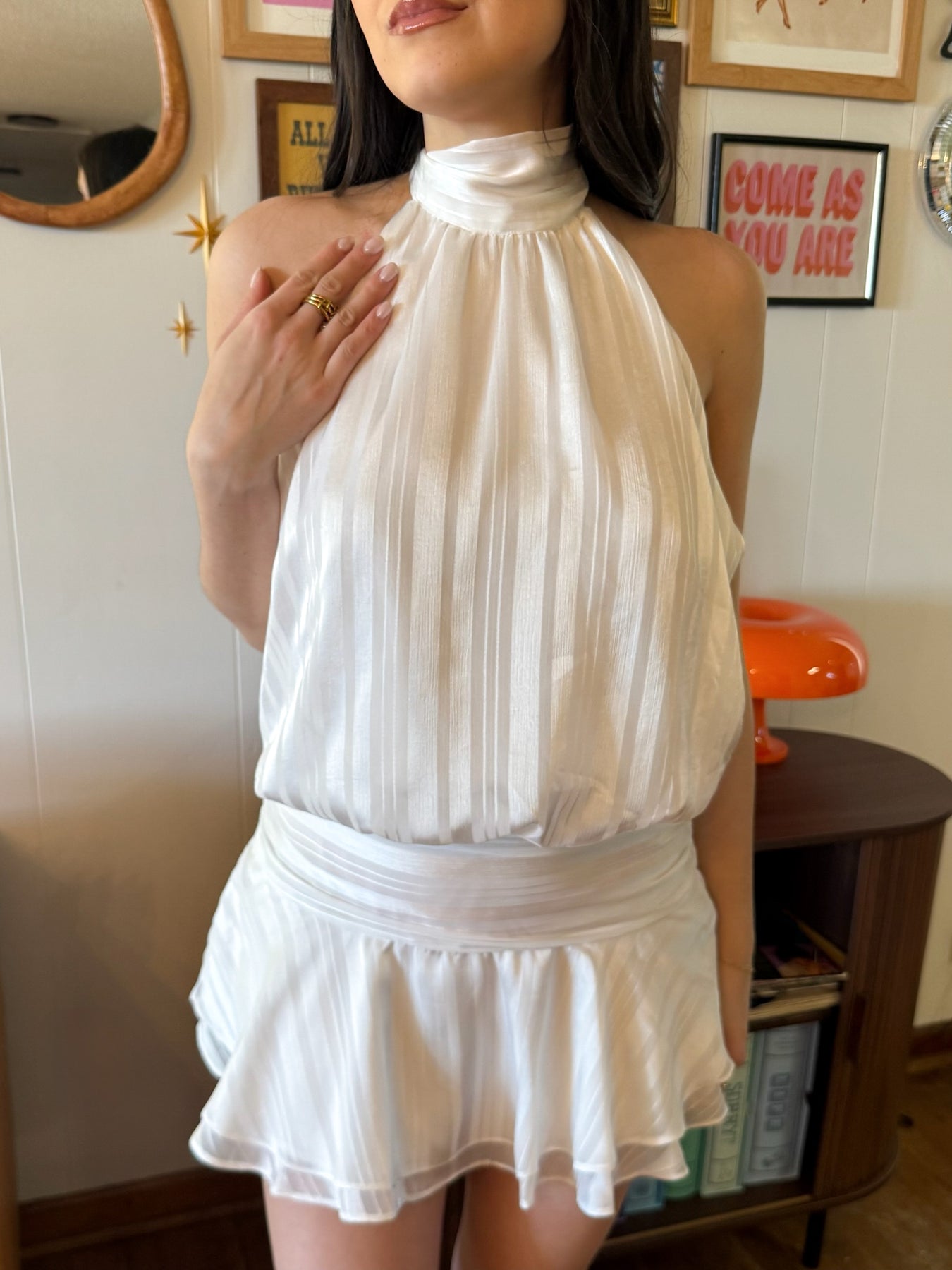 Clean, effortless, and just a little flirty—this white halter dress is made for warm days and easy nights. The halter neckline keeps it sleek up top, while the low back adds the perfect touch of edge. A subtle striped texture gives it a little extra detail without taking away from its minimal feel.