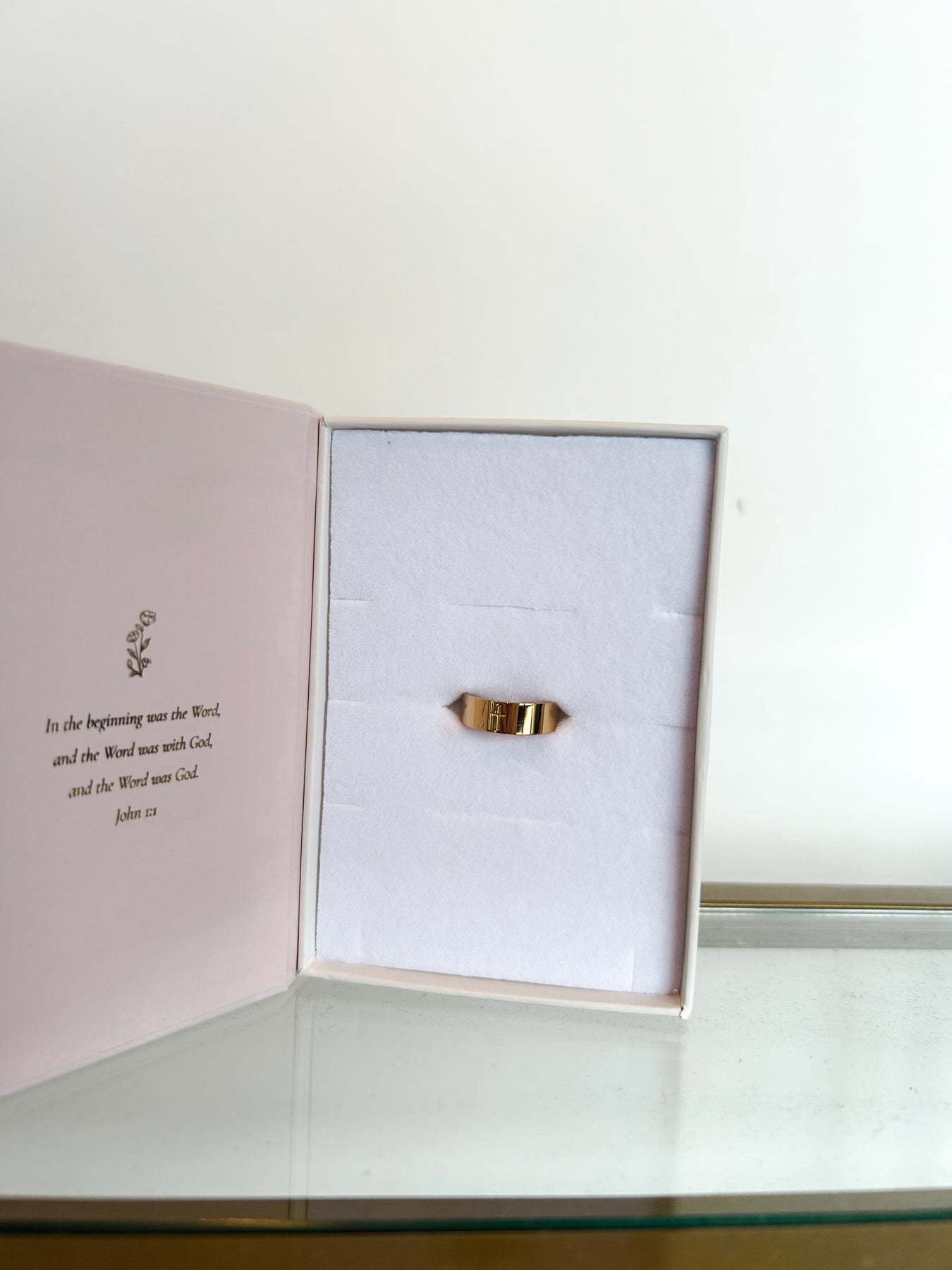 Simple, timeless, and effortlessly elegant—this gold ring features a thick band with a subtle cross design that adds just the right touch of meaning and style. The bold yet minimal silhouette makes it a standout piece while still being versatile enough for everyday wear.