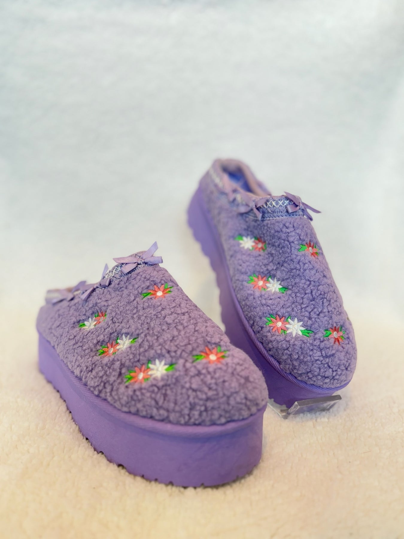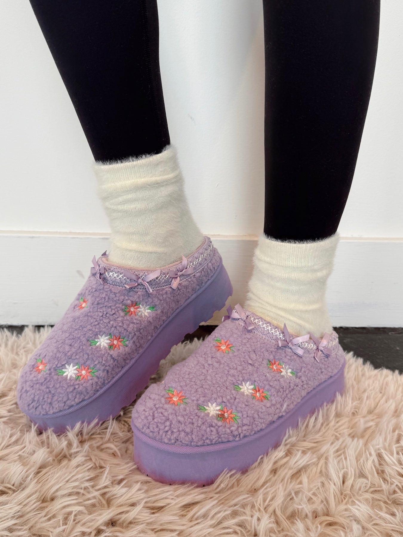 Step into cozy cuteness with these Short 'N Sweet Platform Sherpa Slides. Featuring a plush pastel sherpa upper adorned with delicate embroidered flowers and a charming bow, these slides deliver girly charm with serious comfort. The chunky rubber platform sole keeps you elevated and supported all day long, making them perfect for lounging at home or running errands in style. Sweet, comfortable, and undeniably adorable.