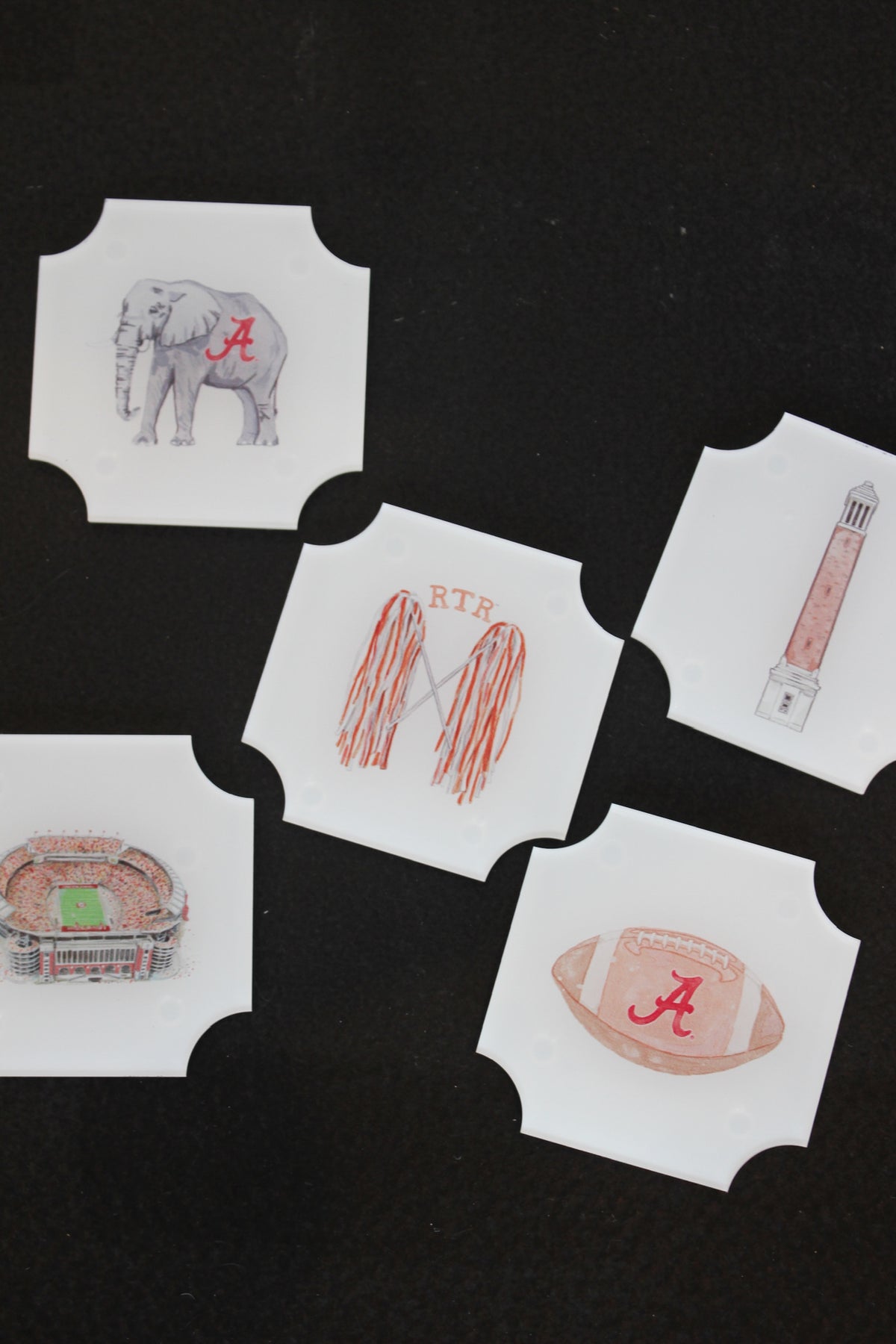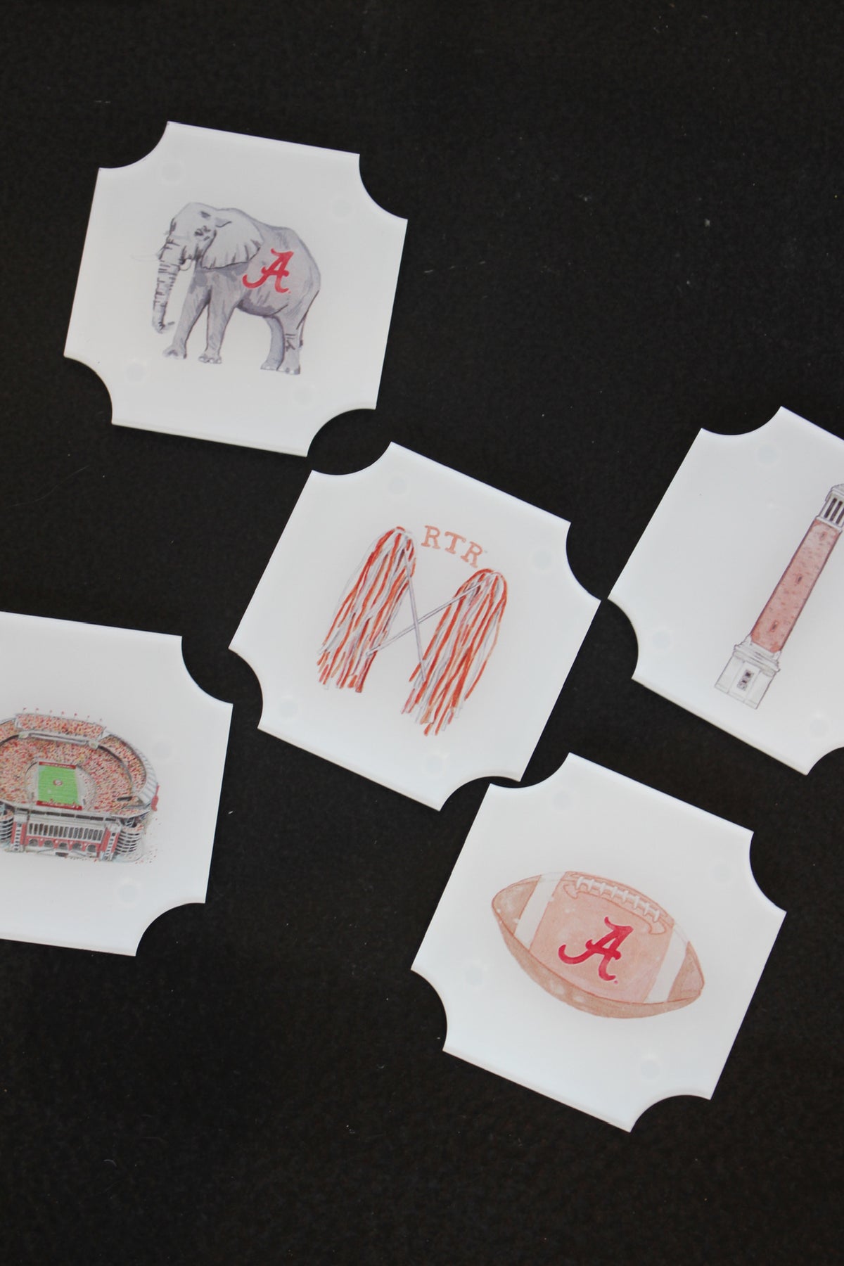 Celebrate your favorite college town in style with this thoughtfully designed set of five acrylic coasters. Featuring a crisp white base accented with iconic moments and landmarks from Tuscaloosa and The University of Alabama, each piece brings a subtle yet meaningful nod to game days, campus memories, and Southern charm.