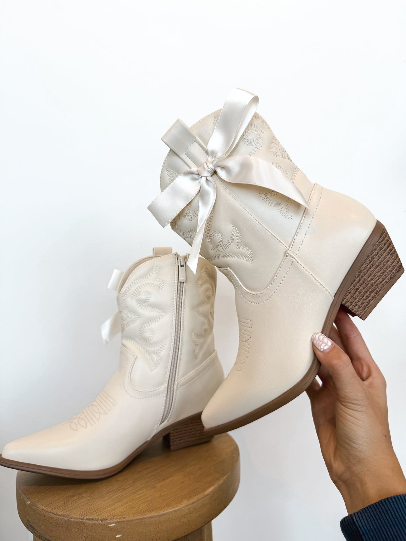 Step out in style with the Willa Satin Bow Booties in Ivory! Featuring a charming satin bow and a short heel, these mini booties blend comfort with playful elegance. Perfect for any occasion, their versatile design makes them a go-to for day or night looks. Slip into effortless chic and let your feet do the talking!
