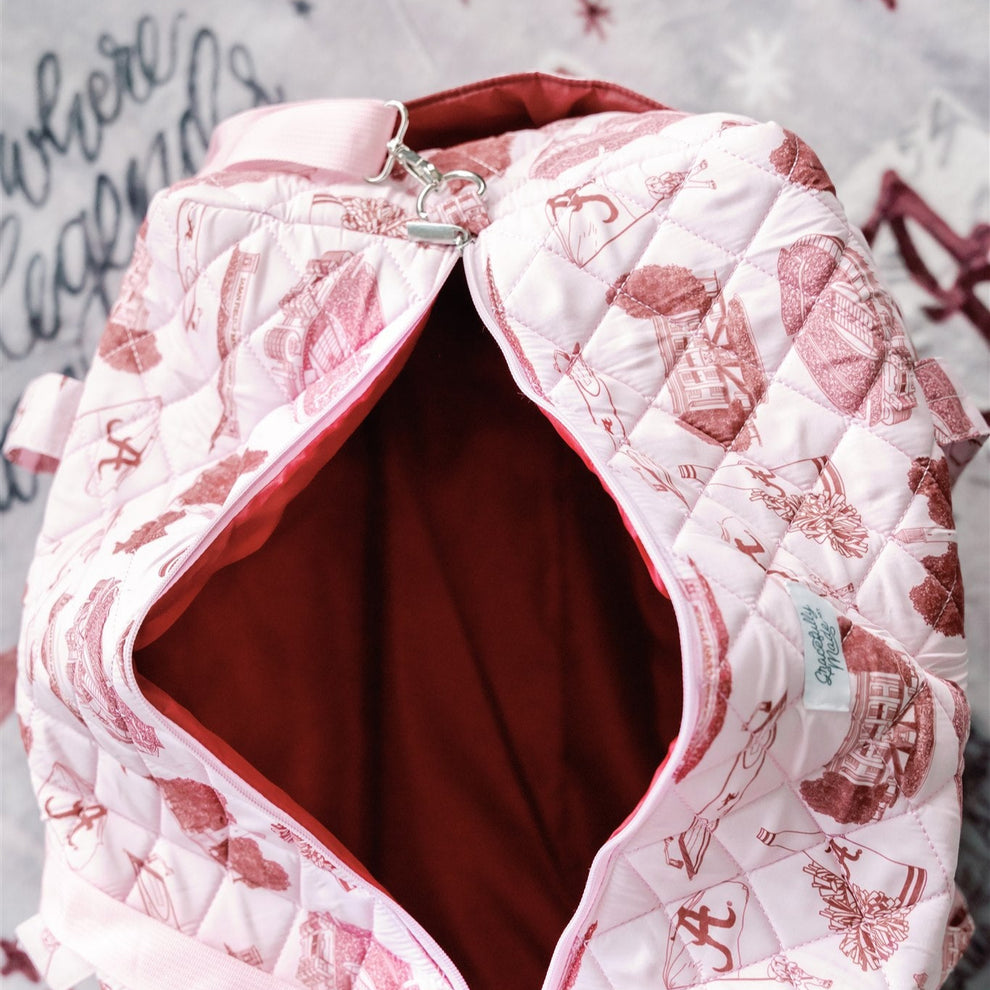Our quilted Alabama duffle is the perfect blend of practicality and school spirit. Featuring iconic Tuscaloosa landmarks and symbols in a charming, detailed print, this bag is a stylish way to show off your love for the university. Its spacious interior and durable quilted fabric make it ideal for travel, sports events, or everyday use, while the comfortable straps ensure easy carrying. Whether you’re heading to class or the game, this duffle brings a touch of Crimson Tide pride to your day. Dimensions: 22.0" w x 17.0" h x 11.5" d - Handles+ adjustable strap - Zipper closure - Crimson interior - Inside mesh pockets and 3 exterior pockets