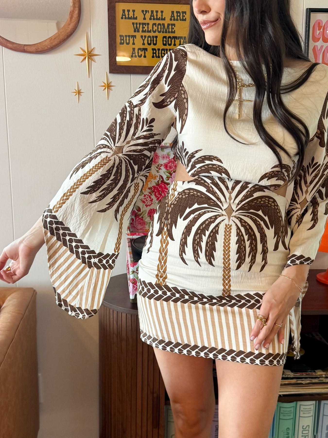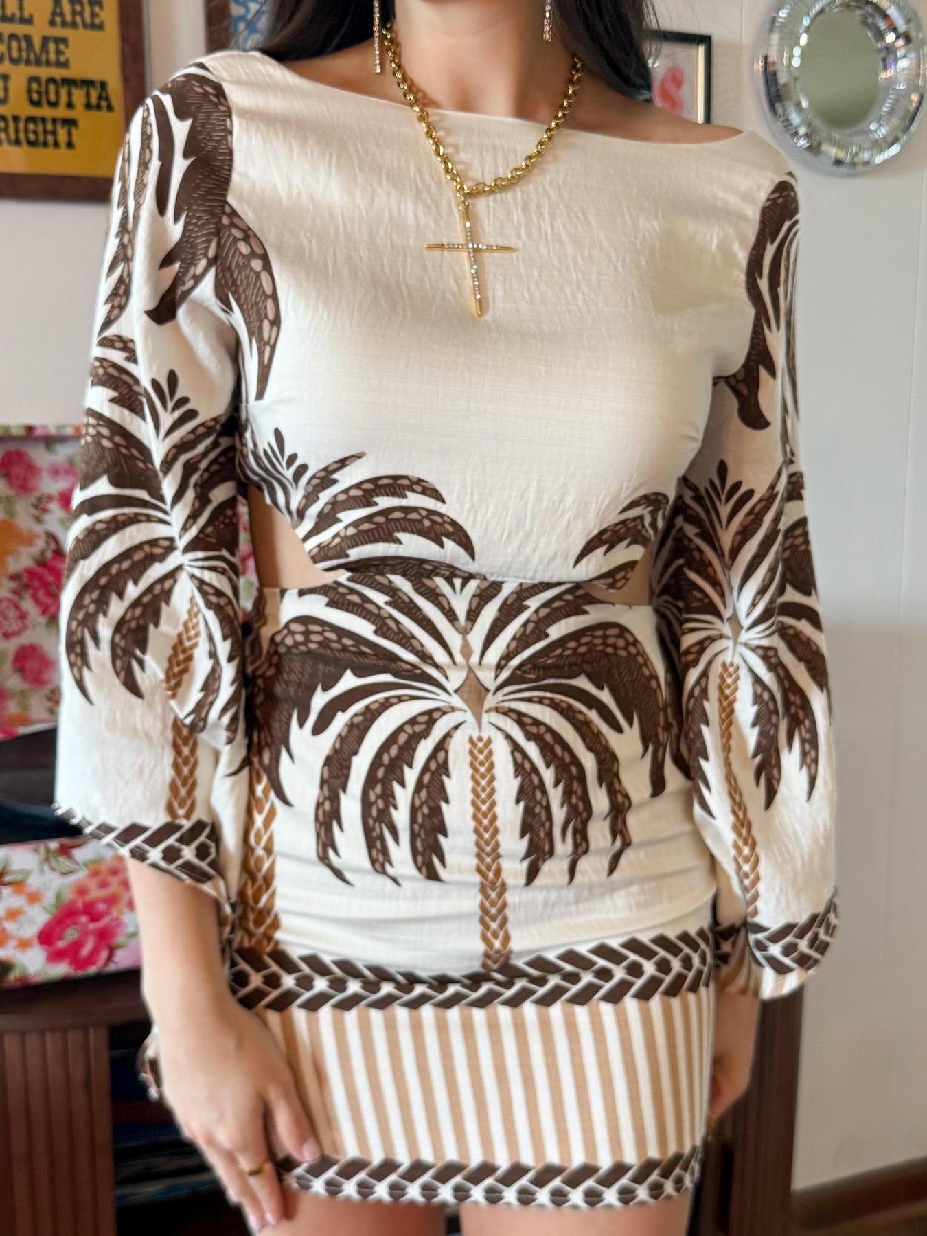 A refined mini dress featuring an elegant palm motif that brings a modern resort-inspired mood. Designed with a clean boat neckline and structured long straight sleeves, this piece offers a balanced silhouette with subtle side cut-out details at the waist for a flattering fit. The contrast cuff and hem detailing add visual interest, while the mini length keeps the look chic and contemporary. Perfect for daytime events, vacations, or elevated casual styling.