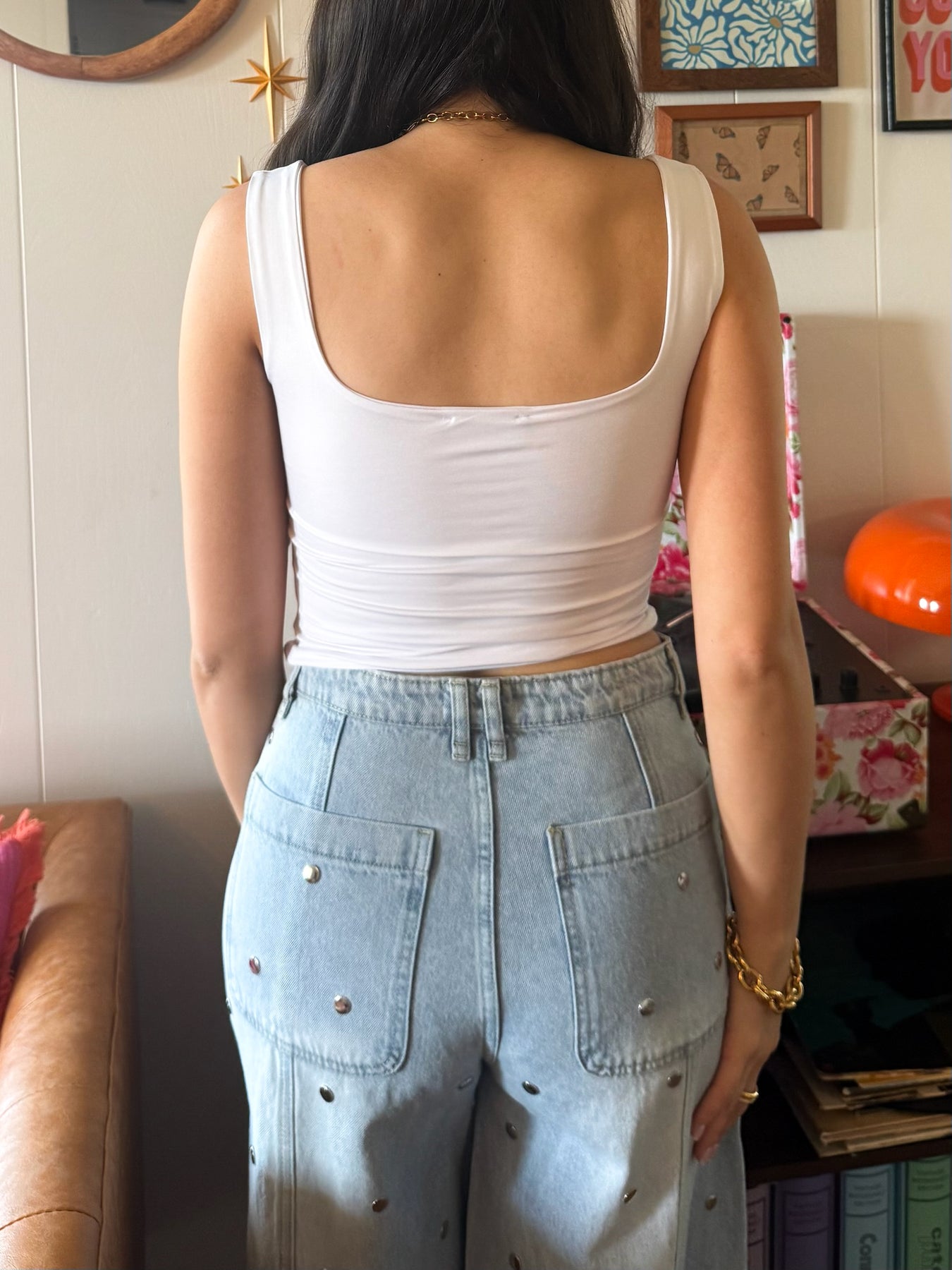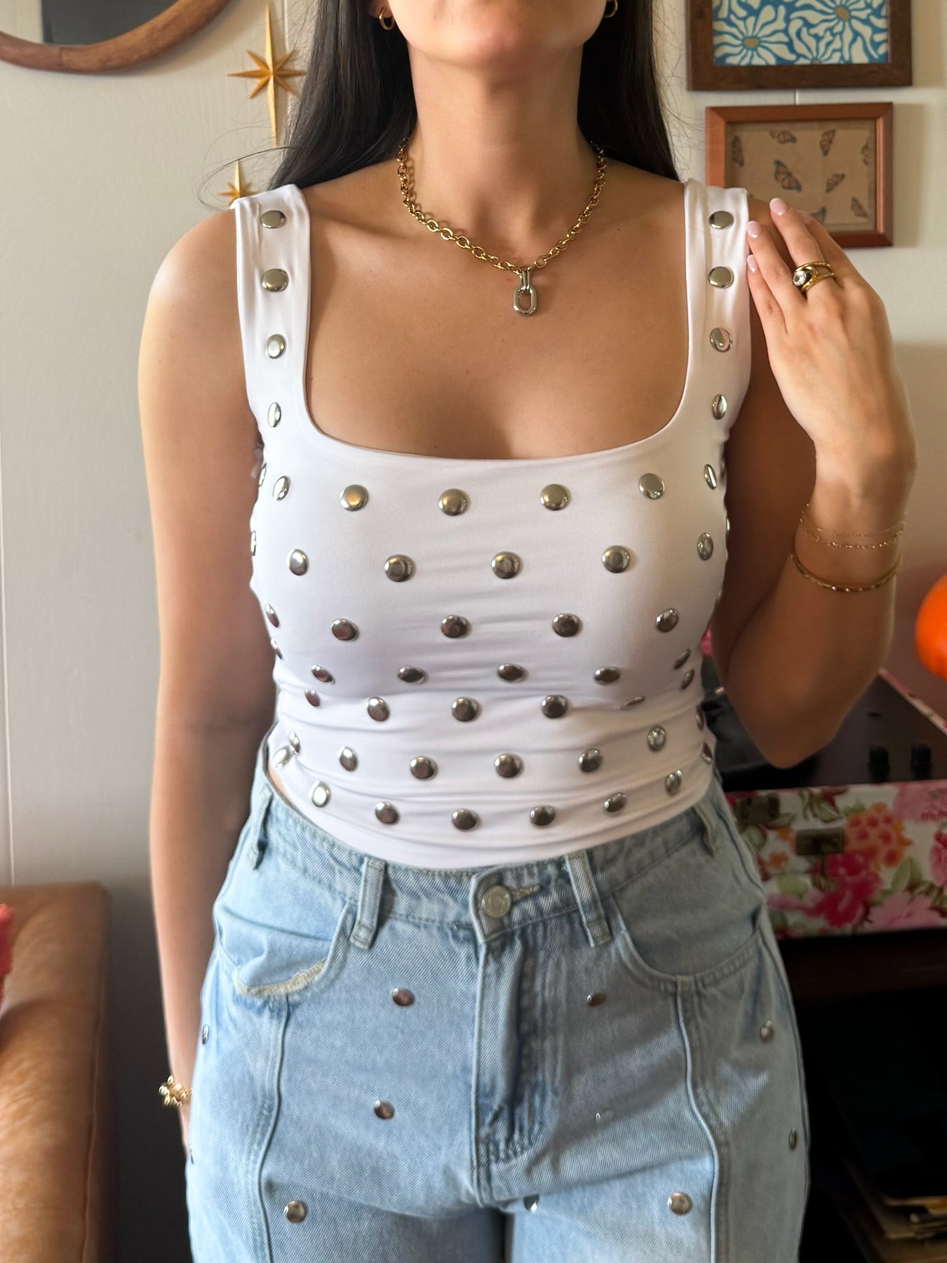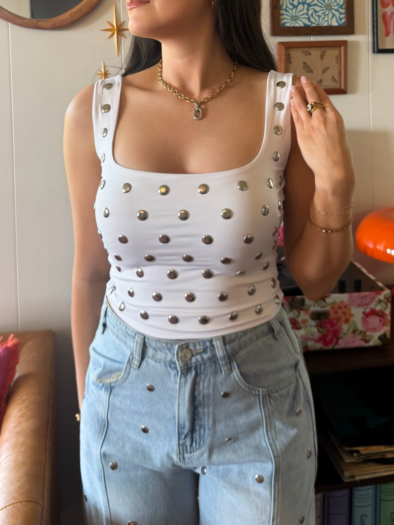 Your new go-to for a night out. This cropped, fitted tank features a flattering square neckline and eye-catching silver circle stud details that add just the right amount of edge. Made from a soft, stretchy fabric, it hugs your shape in all the right places while still keeping you comfortable. An elevated basic you’ll keep reaching for—perfect for pairing with denim, trousers, or a sleek skirt when you want an effortless but polished look.