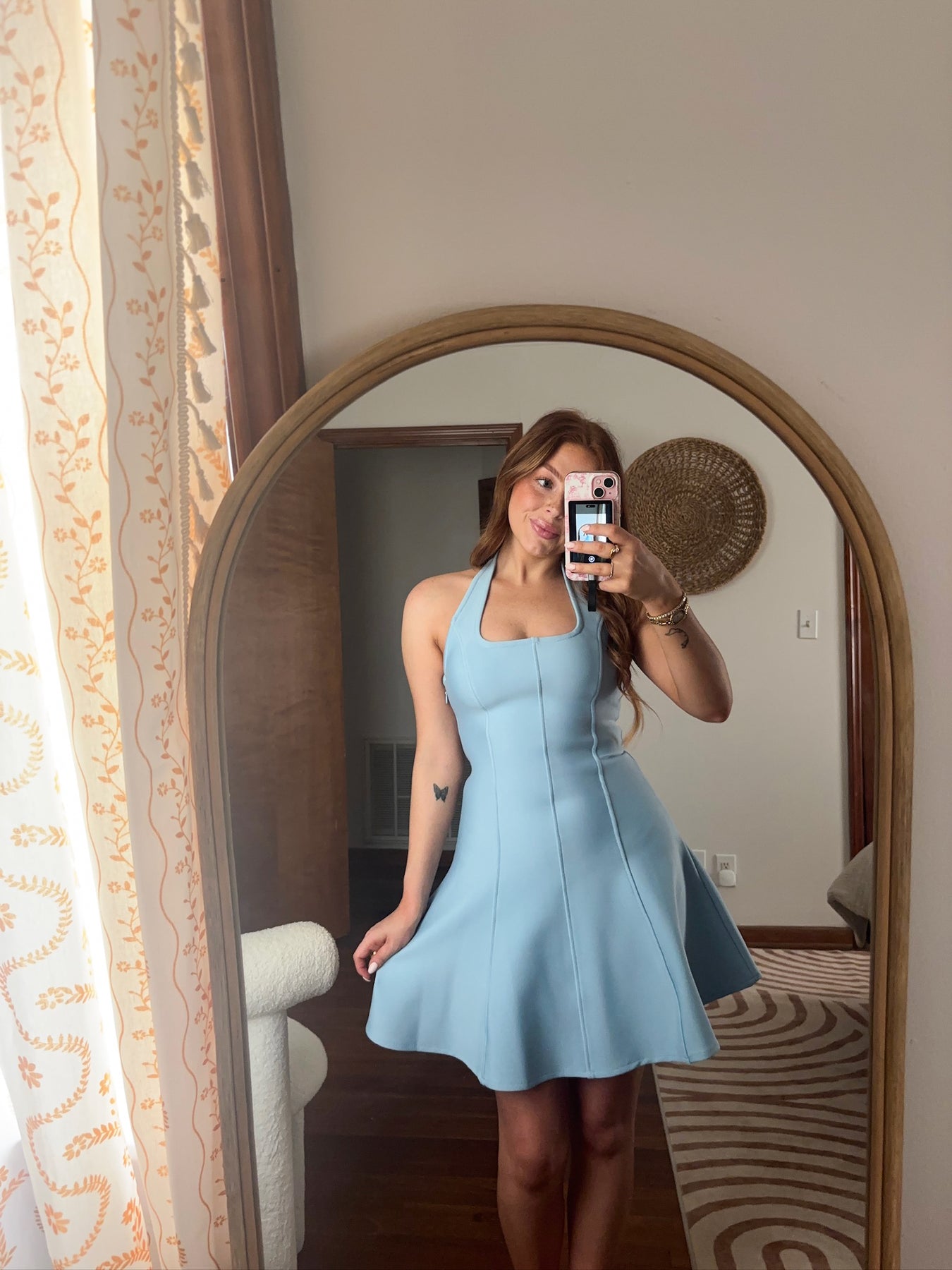 A flirty, feel-good favorite, this halter neck dress features a flattering fit-and-flare silhouette that cinches at the waist and flows effortlessly. The open back is elevated with delicate strappy detailing, adding the perfect touch of allure. Fun, feminine, and easy to wear, it’s the kind of dress that makes every moment feel a little more special.