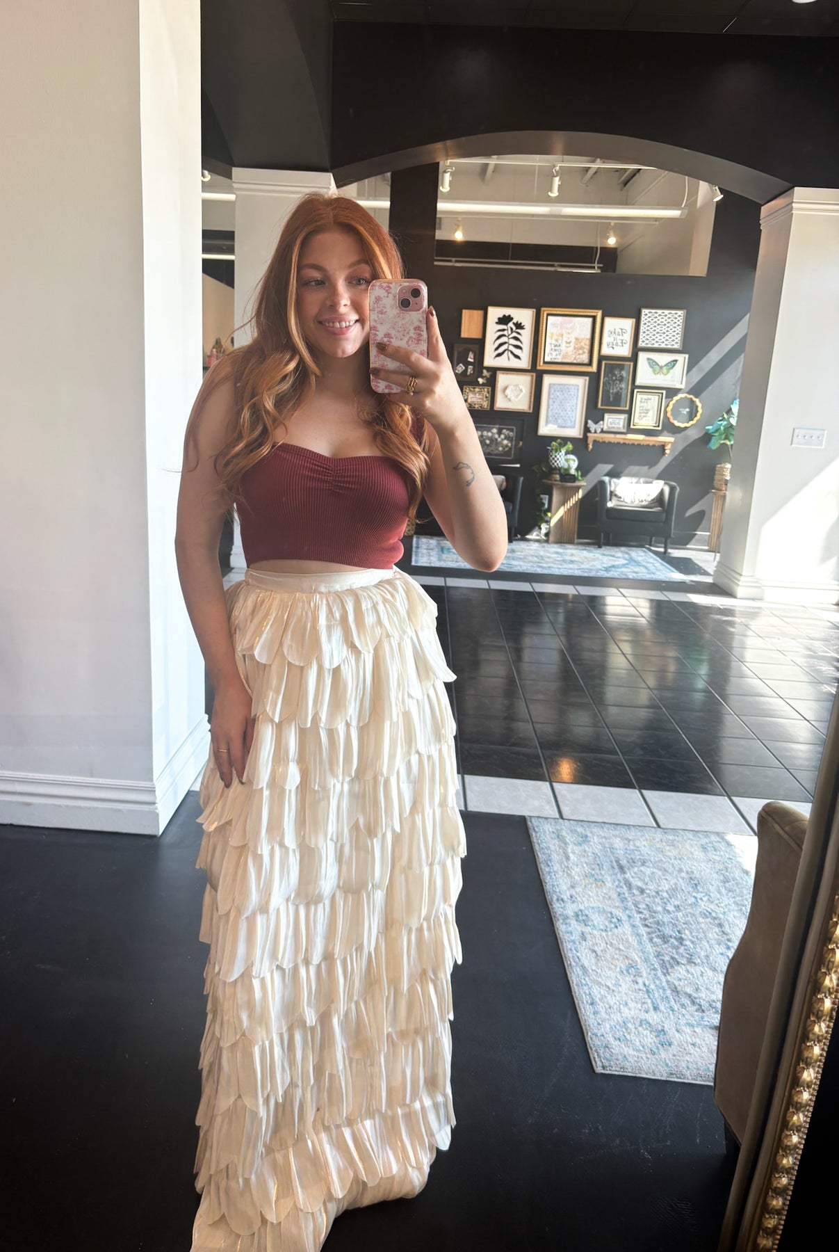 Elevate your style with the Champagne Ruffles Maxi Skirt, featuring a high-rise waist and delicate satin ruffles. Its elegant, flowy silhouette moves gracefully, perfect for dancing through your day or night. Versatile enough to dress up or down, this skirt brings effortless charm to any outfit.
