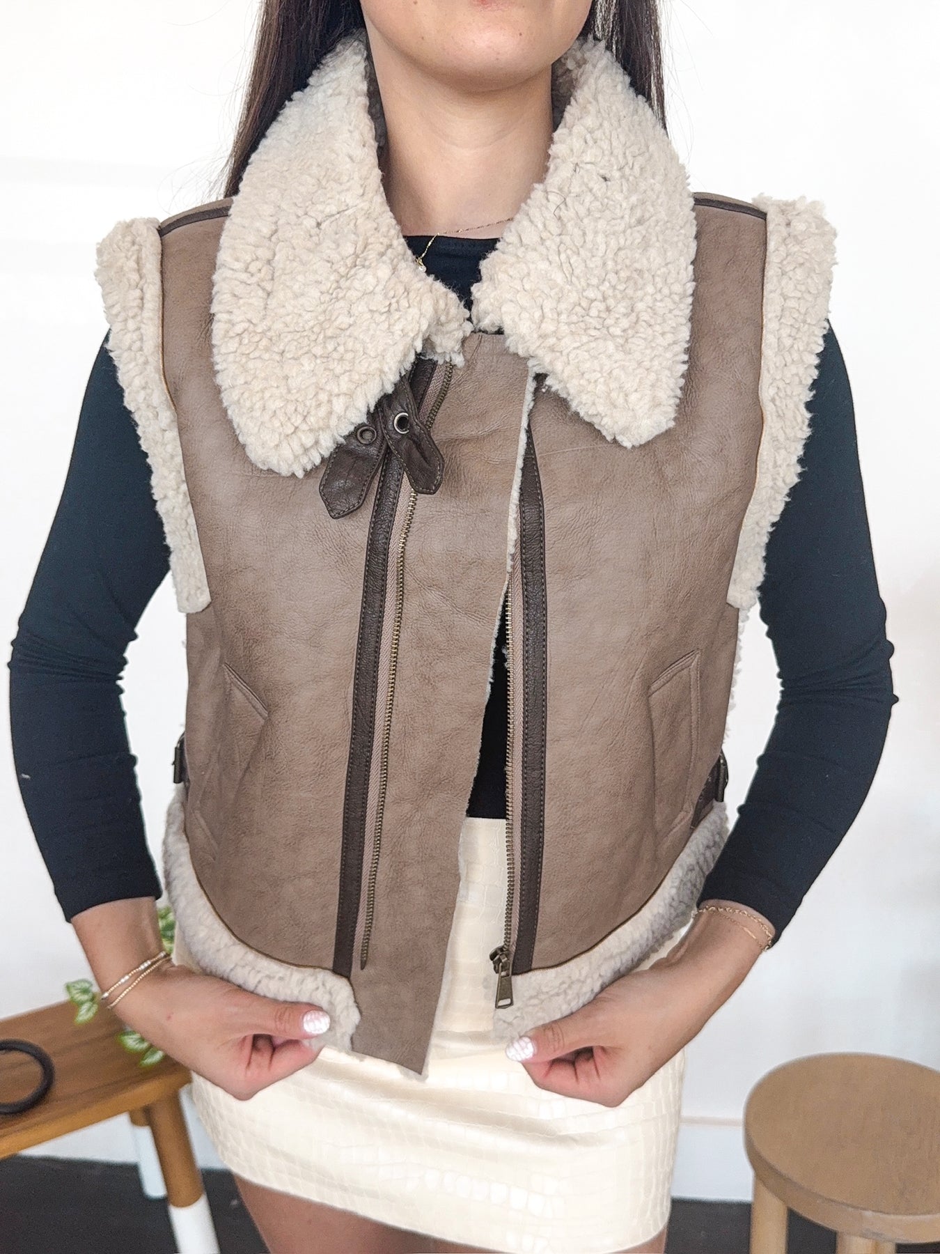 Stay cozy and cool in this Sherpa Leather Vest. Featuring a soft sherpa lining and a stylish collar, this mid-length faux leather vest is perfect for layering any time of year. Its versatile design effortlessly amps up your look while keeping you comfortably warm.