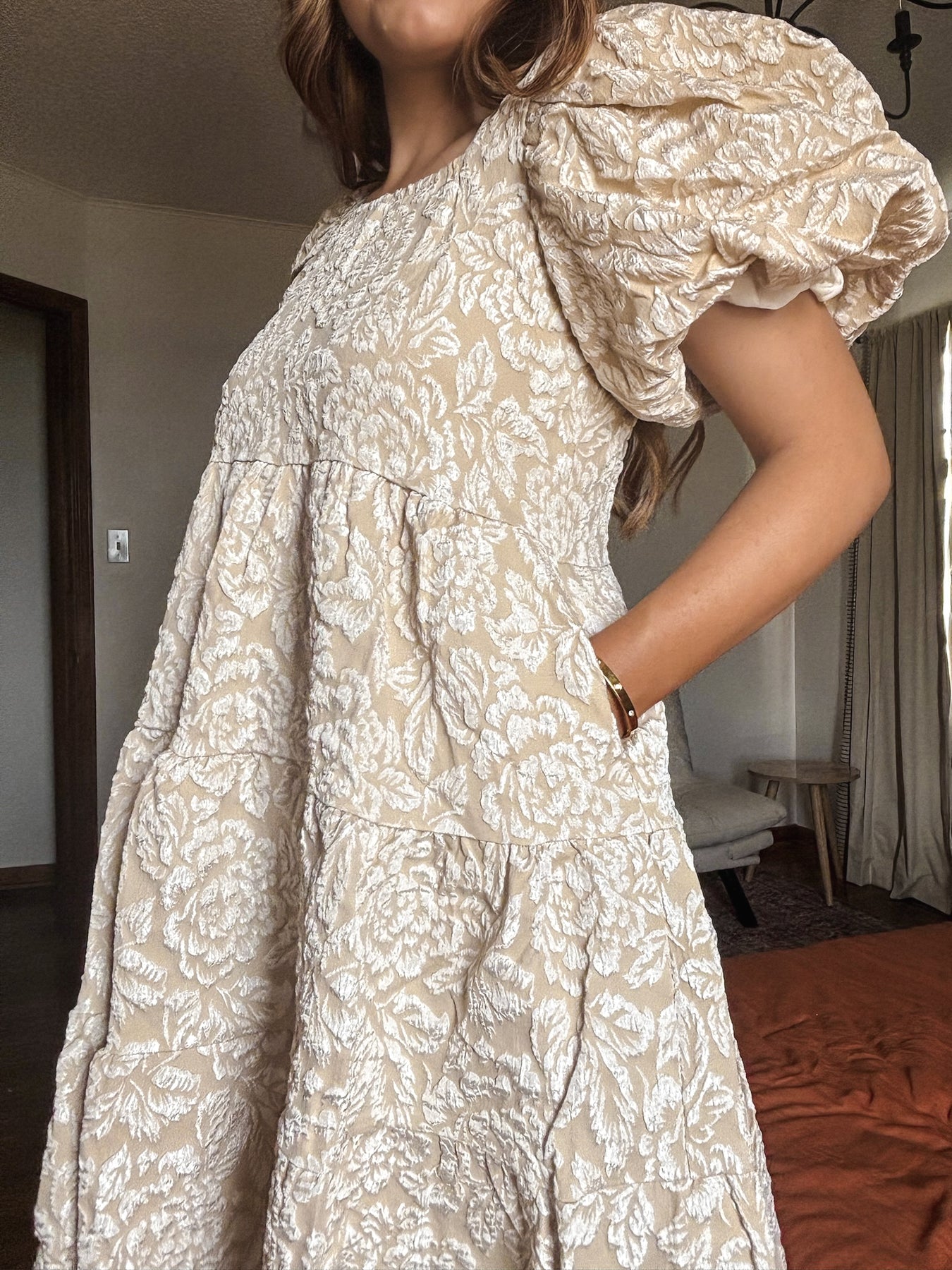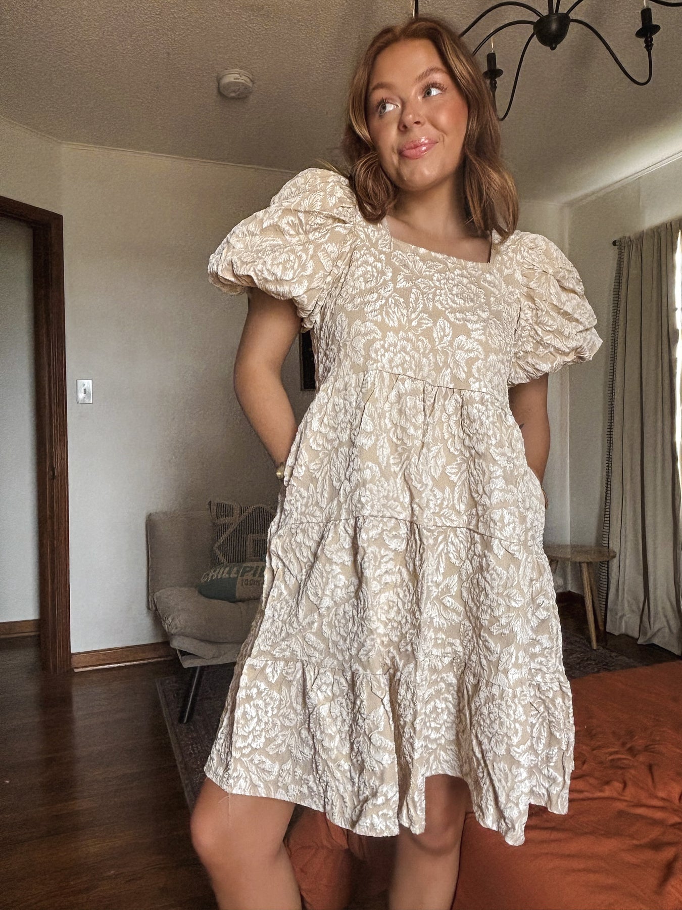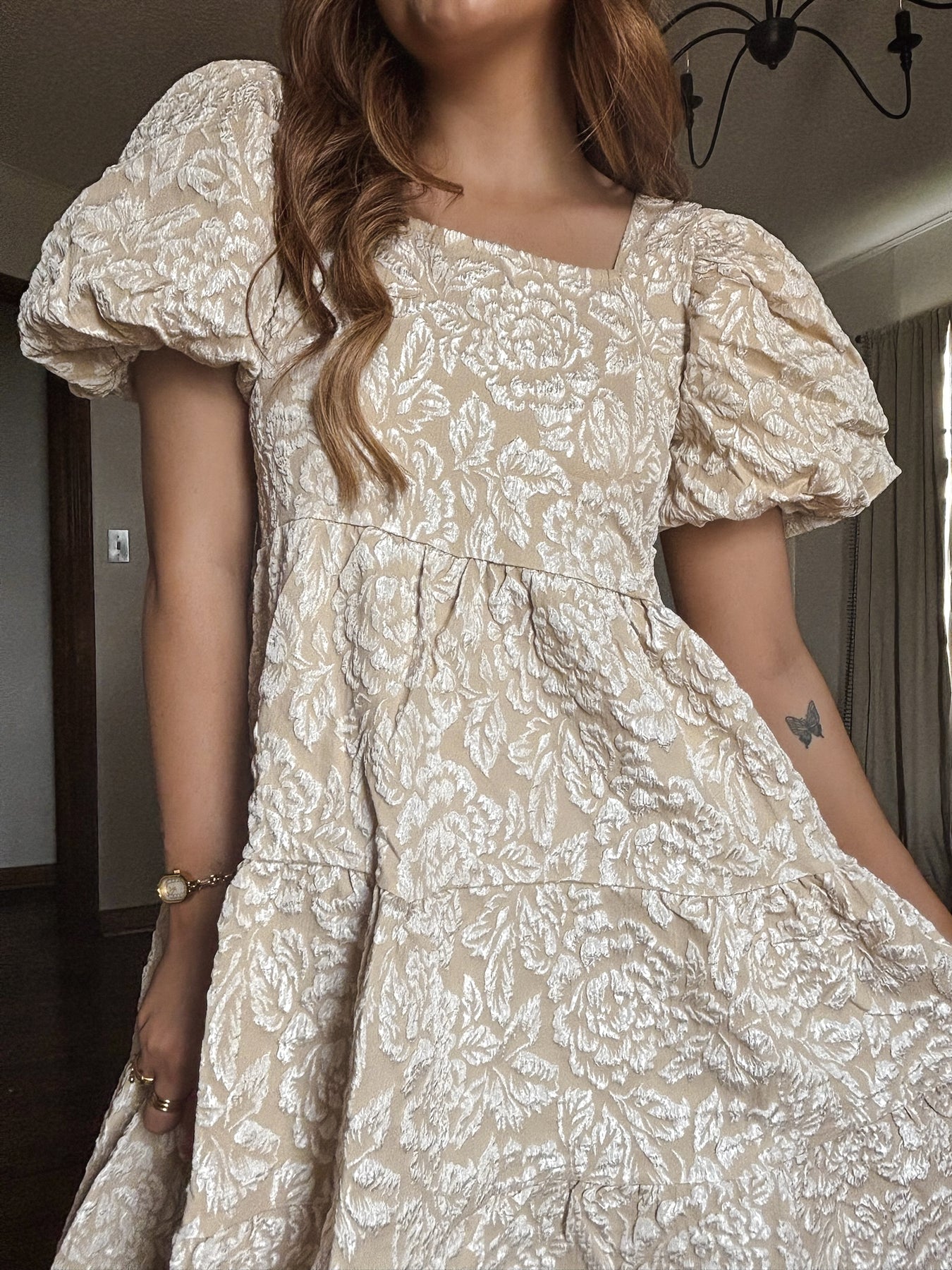 Soft, flowy, and effortlessly feminine—this dress is made for easy, everyday moments. Featuring a high square neckline and subtle puff sleeves, it has just the right amount of structure while still feeling light and airy. The tiered ruffles add movement and a playful touch, and the neutral floral pattern keeps it versatile and easy to style.