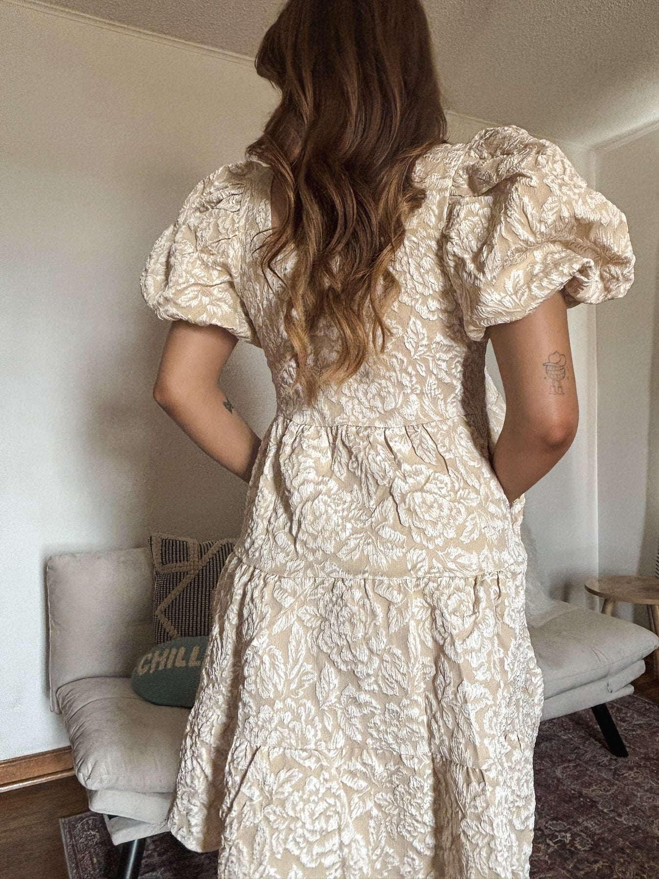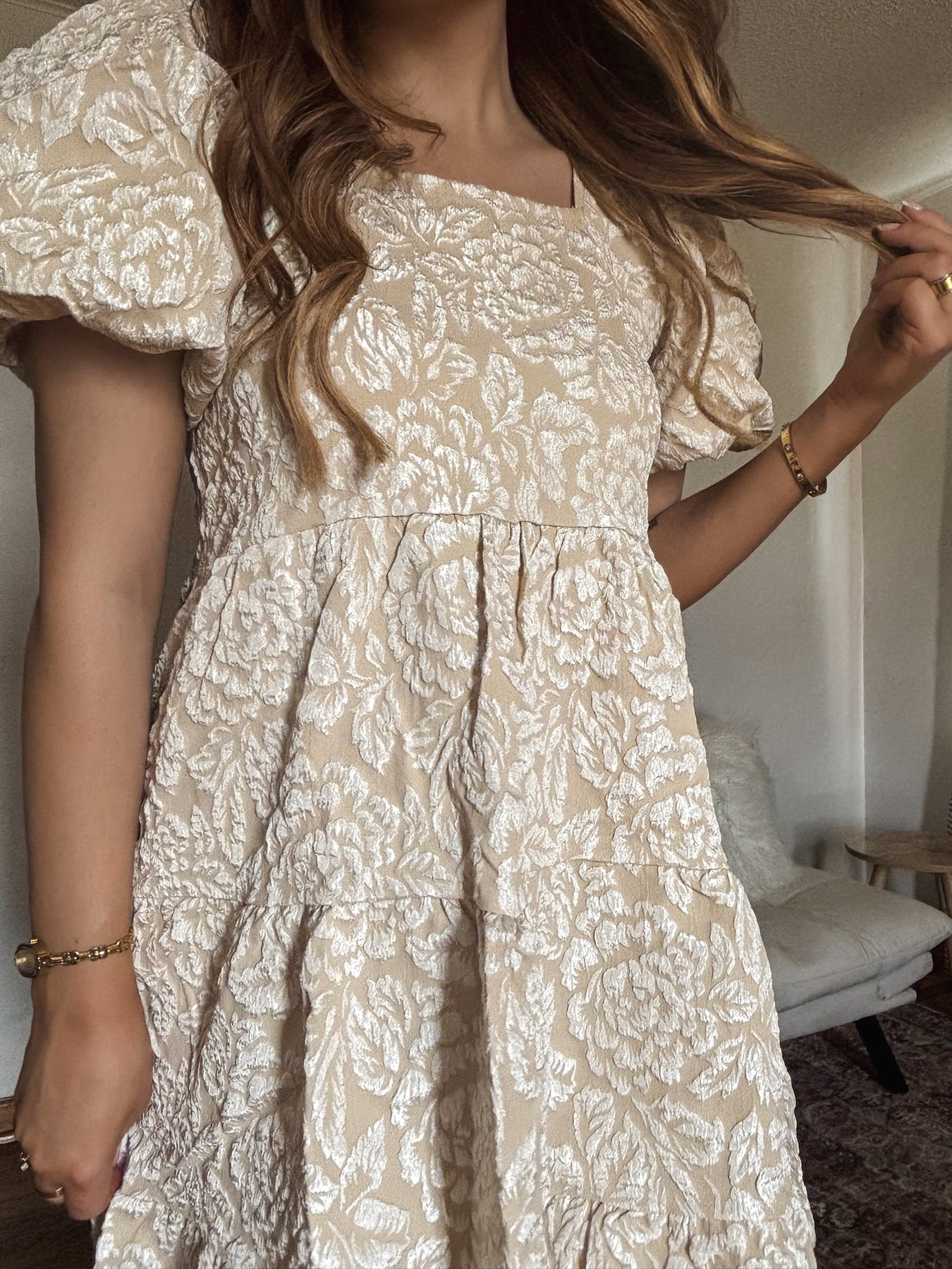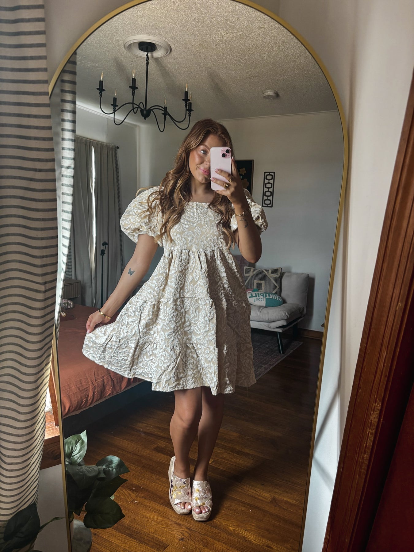 Soft, flowy, and effortlessly feminine—this dress is made for easy, everyday moments. Featuring a high square neckline and subtle puff sleeves, it has just the right amount of structure while still feeling light and airy. The tiered ruffles add movement and a playful touch, and the neutral floral pattern keeps it versatile and easy to style.